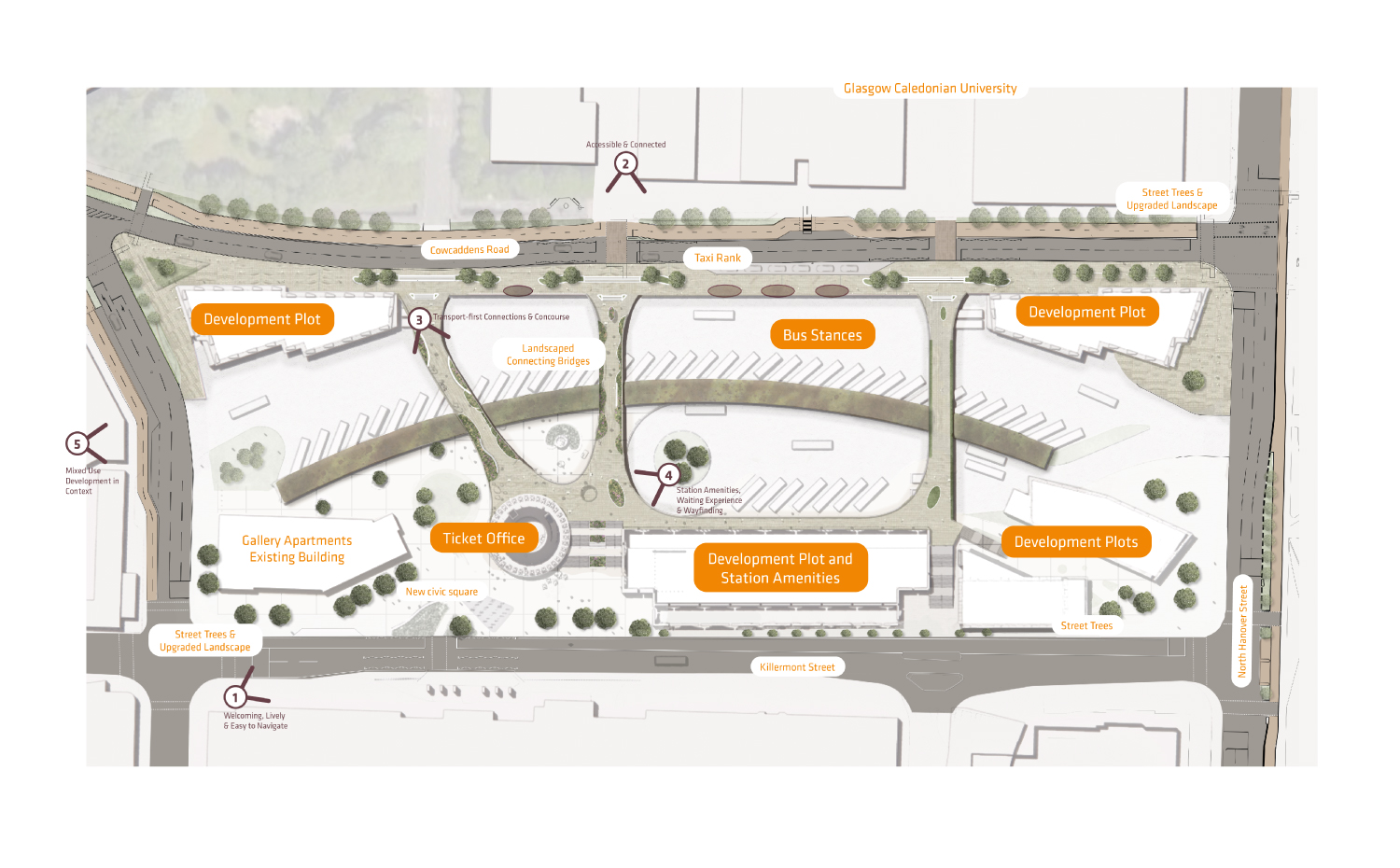 We are creating a new vision and masterplan for Buchanan Bus Station and the surrounding urban block. This will include changes to the existing bus station, its surrounding public realm and how it interacts with neighbouring locations, as well as setting out what you need from a modern bus station. It will also consider if there is the opportunity to introduce other types of buildings into the area, which will complement the operation of the station and the area around it. The current project focus is only on the development of a new vision and masterplan for the bus station. The images and plans show early ideas of what the masterplan could look like. No detailed design or construction are proposed at this stage.