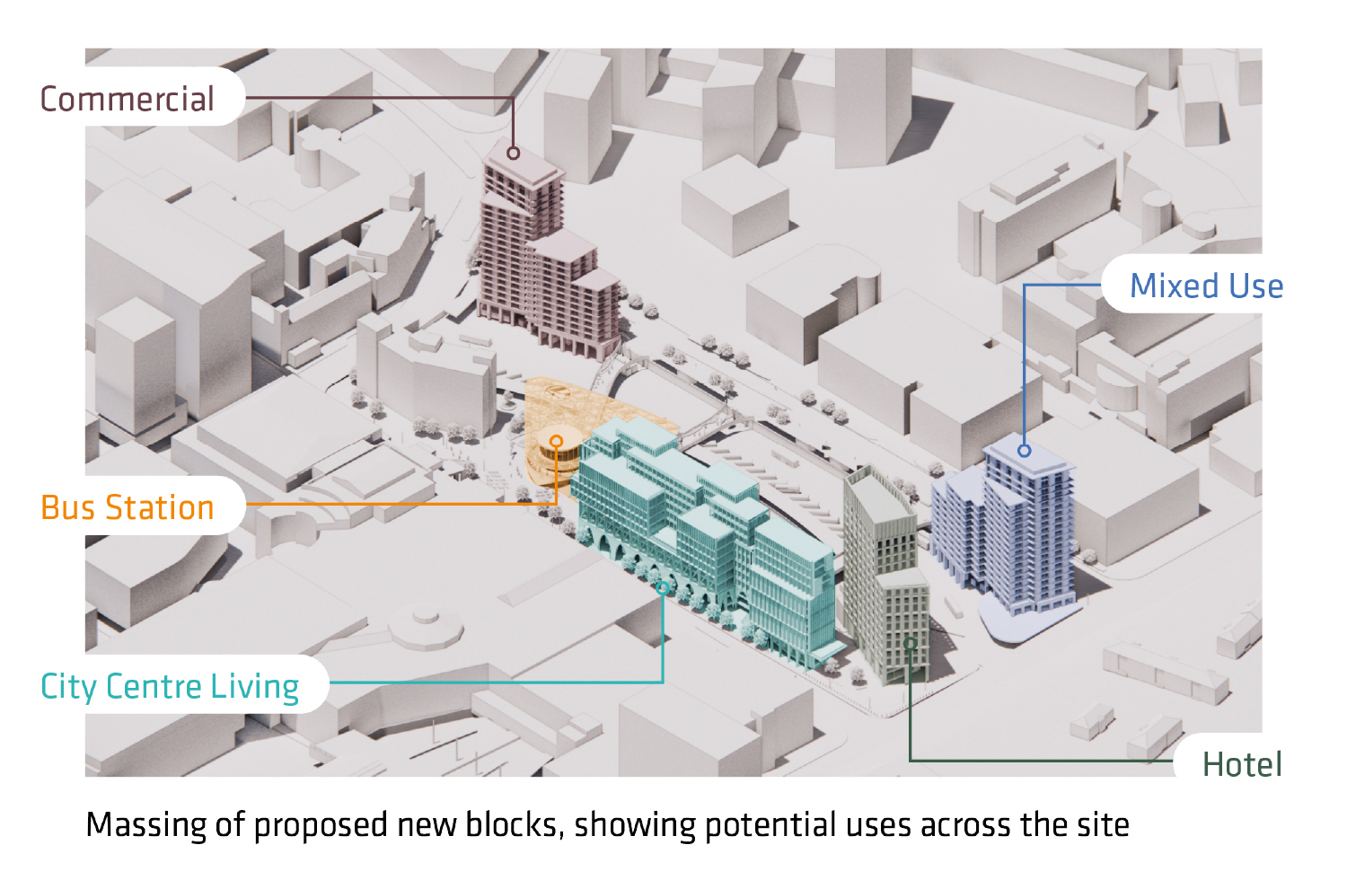 BBS Masterplan: Massing of proposed new blocks, showing potential uses across the site.